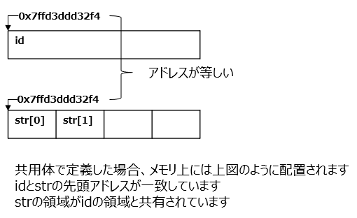 idとstrは独立した領域であるため、構造体のサイズはidとstrの両方が保持できる大きさが確保されます